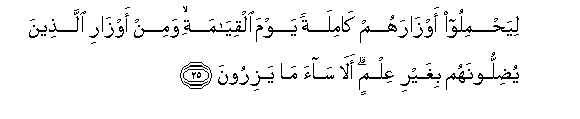 25. Ili wabebe mizigo yao kwa ukamilifu Siku ya Kiyama, na sehemu ya mizigo ya wale wanao wapoteza bila ya kujua. Angalia, ni maovu mno hayo wanayo yabeba!