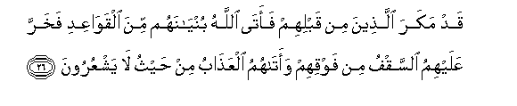 26. Walipanga vitimbi walio kuwa kabla yao, Mwenyezi Mungu akayasukua majengo yao kwenye misingi, dari zikawaporomokea juu yao, na adhabu ikawajia kutoka wasipo kujua.