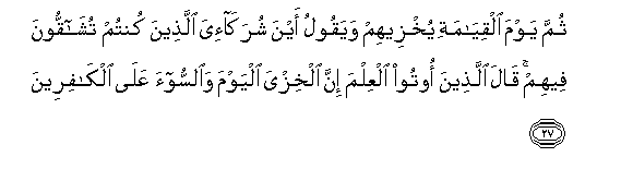 27. Kisha Siku ya Kiyama atawahizi na atasema: Wako wapi hao washirika wangu ambao kwao mkiwakutisha (Manabii) mashaka? Watasema walio pewa ilimu:Hakika leo ndiyo hizaya na adhabu itawashukia makafiri,