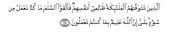 28. Ambao Malaika waliwafisha nao wamejidhulumu nafsi zao! Basi watasalimu amri, waseme: Hatukuwa tukifanya uovu wowote. (Wataambiwa): Kwani! Hakika Mwenyezi Mungu anajua sana mliyo kuwa mkiyatenda.