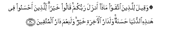 30. Na wataambiwa walio mcha Mungu: Mola wenu Mlezi kateremsha nini? Watasema: Kheri. Walio fanya wema katika dunia hii watapata wema. Na nyumba ya Akhera ni bora zaidi, na njema mno nyumba ya wachamngu.