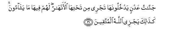 31. Bustani za milele wataziingia; iwe inapita kati yake mito. Humo watapata watakacho. Hivi ndivyo Mwenyezi Mungu awalipavyo wenye kumcha.