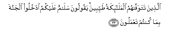 32. Wale ambao Malaika huwafisha katika hali njema, wanawaambia:Amani iwe juu yenu! Ingieni Peponi kwa sababu ya yale mliyo kuwa mkiyatenda.
