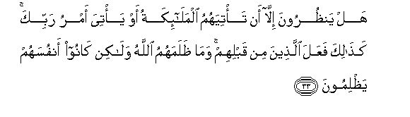 33. Wanangojea jengine hawa ila Malaika wawafikie, au iwafikie amri ya Mola wako Mlezi? Kama hivyo walitenda walio kuwa kabla yao. Na MwenyeziMungu hakuwadhulumu, lakini walijidhulumu wenyewe.