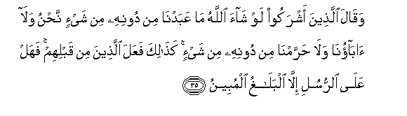 35. Na washirikina wanasema: Mwenyezi Mungu angeli taka tusingeliabudu chochote badala yake, sisi wala baba zetu, wala tusingeli harimisha chochote bila ya Yeye. Kama hivyo walifanya walio kuwa kabla yao. Basi lipo lolote juu ya Mitume isipo kuwa kubalighisha kwa uwazi?