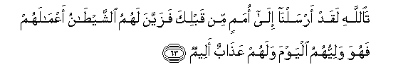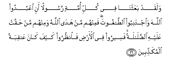 36. Na kwa hakika kwa kila umma tuliutumia Mtume kwamba: Muabuduni Mwenyezi Mungu, na muepukeni Shetani. Basi kati yao wapo alio waongoa MwenyeziMungu. Na kati yao wapo ambao ulio wathibitikia upotovu. Basi tembeeni katika ardhi, muangalie ulikuwaje mwisho wa wanao kanusha.