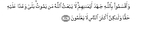38. Na wanaapa kwa Mwenyezi Mungu ukomo wa viapo vyao kwamba MwenyeziMungu hatomfufua aliye kufa. Kwani! Ni ahadi iliyo juu yake kikweli; lakini watu wengi hawajui.
