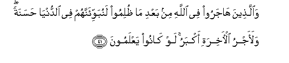 41. Na wale walio hama kwa ajili ya Mwenyezi Mungu baada ya kudhulumiwa,bila ya shaka tutawaweka duniani kwa wema; na ujira wa Akhera ni mkubwa zaidi; laiti kuwa wanajua!