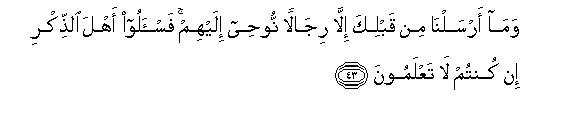 43. Nasi hatukuwatuma kabla yako ila watu wanaume tulio wapa Wahyi(Ufunuo). Basi waulizeni wenye ukumbusho kama nyinyi hamjui.