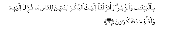 44. Kwa Ishara wazi na Vitabu. Nasi tumekuteremshia wewe Ukumbusho ili uwabainishie watu yaliyo teremshwa kwao, wapate kufikiri.