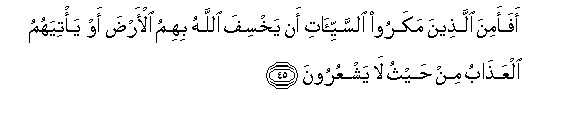 45. Je! Wameaminisha wanao fanya vitimbi vya uovu kwamba MwenyeziMungu hatawadidimiza katika ardhi, na haitawafika adhabu kutoka wasipopajua?