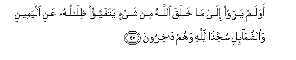 48. Je! Hawavioni vitu alivyo viumba Mwenyezi Mungu - vivuli vyao vinaelekea kushotoni na kuliani, kumsujudia Mwenyezi Mungu na vikinyenyekea?