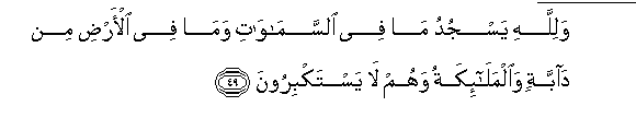49. Na vyote viliomo katika mbingu na katika ardhi, tangu wanyama mpaka Malaika, vinamsujuidia Mwenyezi Mungu, na wala havitakabari.