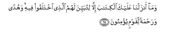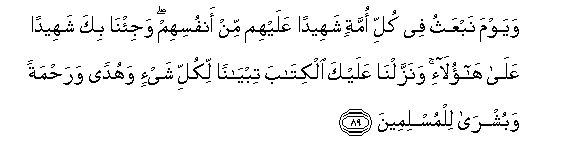 89. Na (waonye) siku tutakapo wainua mashahidi katika kila umma wakiwashuhudia kwa yanayo tokana na wao, na tutakuleta wewe uwe shahidi juu ya hao. Na tumekuteremshia Kitabu hiki kinacho bainisha kila kitu, na ni uwongofu,na rehema, na bishara kwa Waislamu.