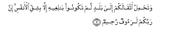 7. Na hubeba mizigo yenu kupeleka kwenye miji msiyo weza kuifikia ila kwa mashaka ya nafsi. Hakika Mola wenu Mlezi ni Mpole na Mwenye kurehemu.