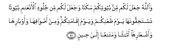 80. Na Mwenyezi Mungu amekujaalieni majumba yenu yawe ni maskani yenu, na amekujaalieni kutokana na ngozi za wanyama nyumba mnazo ziona nyepesi wakati wa safari zenu na wakati wa kutua kwenu. Na kutokana na sufi zao na manyoya yao na nywele zao mnafanya matandiko na mapambo ya kutumia kwa muda.
