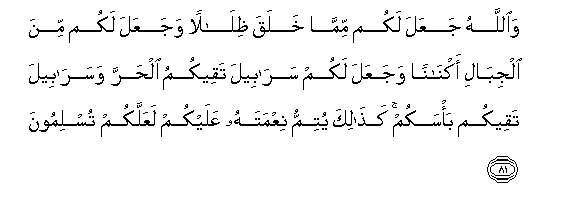 81. Na Mwenyezi Mungu amekufanyieni vivuli katika vitu alivyo viumba,na amekufanyieni maskani milimani, na amekufanyieni nguo za kukingeni na joto, na nguo za kukingeni katika vita vyenu. Ndio hivyo anakutimizieni neema zake ili mpate kut'ii.