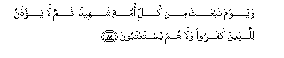 84. Na siku tutakapo wainua kutokana na kila umma shahidi, kisha hawataruhusiwa walio kufuru wala hawataachiliwa kutaka radhi.