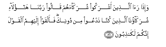 86. Na walio shirikisha watakapo waona hao walio washirikisha na Mwenyezi Mungu, watasema: Mola wetu Mlezi! Hawa ndio washirikishwa wetu ambao tulikuwa tukiwaabudu badala yako. Ndipo wale watakapo watupia kauli:Hakika nyinyi ni waongo!
