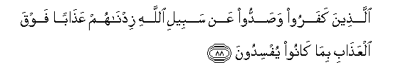 88. Wale walio kufuru na kuzuilia Njia ya Mwenyezi Mungu tutawazidishia adhabu juu ya adhabu, kwa walivyo kuwa wakifisidi.