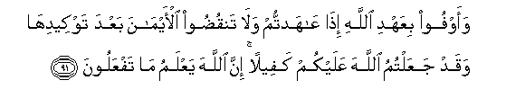 91. Na timizeni ahadi ya Mwenyezi Mungu mnapo ahidi, wala msivunje viapo baada ya kuvithibitisha, ilihali mmekwisha mfanya Mwenyezi Mungu ndiye mdhamini wenu. Hakika Mwenyezi Mungu anayajua myatendayo.