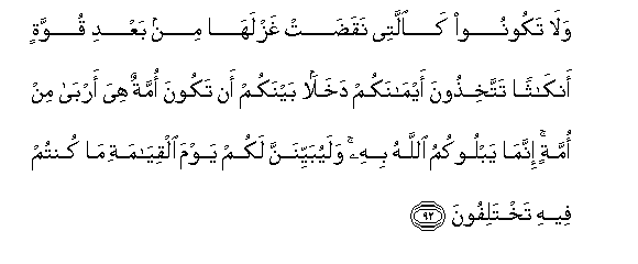 92. Wala msiwe kama mwanamke anaye uzongoa uzi wake baada ya kwisha usokota ukawa mgumu. Mnavifanya viapo vyenu kuwa ni njia ya kudanganyana baina yenu kwa kuwa ati taifa moja lina nguvu zaidi kuliko jengine? Hakika Mwenyezi Mungu anakujaribuni kwa njia hiyo. Na bila ya shaka atakubainishieni Siku ya Kiyama mliyo kuwa mkikhitalifiana.