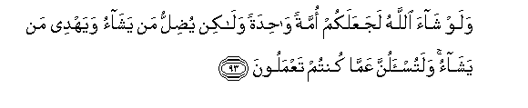 93. Na Mwenyezi Mungu angeli taka, kwa yakini angeli kufanyeni umma mmoja. Lakini anamwachia kupotea anaye mtaka, na anamwongoa amtakaye. Na hakika mtaulizwa kwa yale mliyo kuwa mkiyafanya.