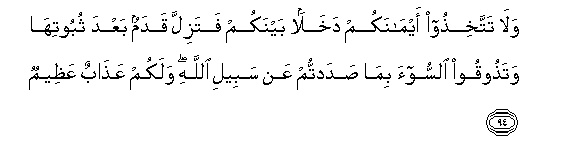 94. Wala msifanye viapo vyenu ni njia ya kudanganyana baina yenu.Usije mguu ukateleza badala ya kuthibiti, na mkaonja maovu kwa sababu ya kule kuzuilia Njia ya Mwenyezi Mungu, na mkapata adhabu kubwa.
