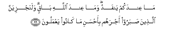 96. Mlivyo navyo vitakwisha na vilivyoko kwa Mwenyezi Mungu ndivyo vitakavyo bakia. Na kwa yakini Sisi tutawapa walio subiri ujira wao kwa bora ya waliyo kuwa wakiyatenda.