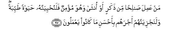 97. Mwenye kutenda mema, mwanamume au mwanamke, naye akawa ni Muumini,tutamhuisha maisha mema; na tutawapa ujira wao kwa bora ya waliyo kuwa wakiyatenda.