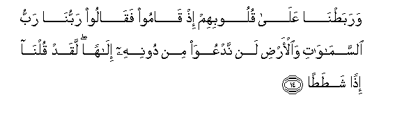 14. Na tukazitia nguvu nyoyo zao walipo simama na wakasema: Mola