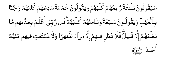 Walikuwa saba, na wa nane wao ni mbwa wao. Sema: Mola wangu Mlezi ndiye