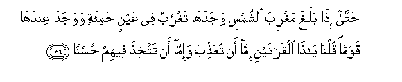 yenye matope meusi. Na hapo akawakuta watu. Tukasema: Ewe Dhul-Qarnaini!