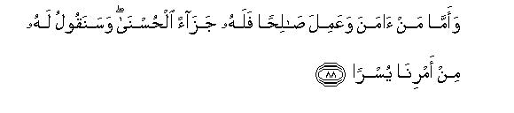 88. Na ama aliye amini na akatenda mema basi atapata malipo mazuri.