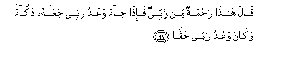 98. Akasema: Hii ni rehema itokayo kwa Mola wangu Mlezi. Na itapo