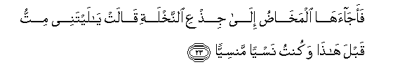 23. Kisha uchungu ukampeleka kwenye shina la mtende; akasema: Laiti