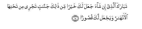 10. Ametukuka ambaye akitaka atakujaalia yaliyo bora kuliko hayo,nayo ni mabustani yapitayo mito kati yao, na atakujaalia majumba ya fakhari.