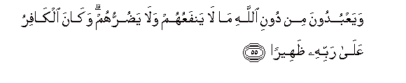 55. Na wanayaabudu badala ya Mwenyezi Mungu yasiyo wafaa wala yasiyo