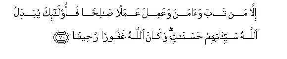 70. Isipo kuwa atakaye tubu, na akaamini, na akatenda vitendo vyema.