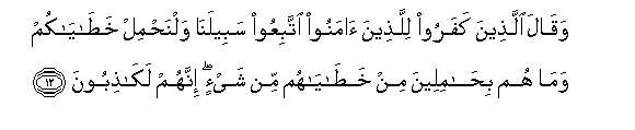 12. Na walio kufuru waliwaambia walio amini: Fuateni njia yetu, nasi