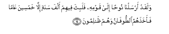 14. Na hakika tulimtuma Nuhu kwa watu wake, na akakaa nao miaka elfu