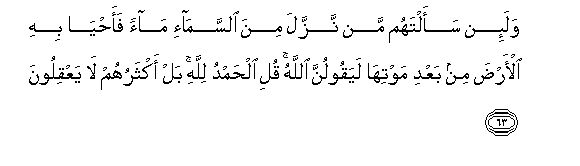 63. Na ukiwauliza: Ni nani anaye teremsha maji kutoka mbinguni, na
