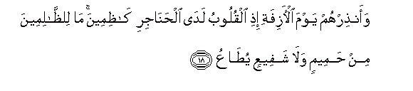 18. Na waonye siku inayo kurubia, wakati nyoyo zitakapo fika kooni,