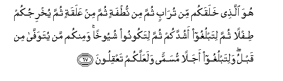 67. Yeye ndiye aliye kuumbeni kwa udongo, kisha kwa tone la manii,