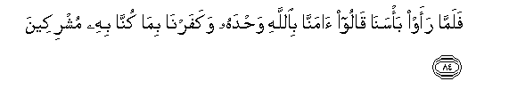 84. Walipo iona adhabu yetu walisema: Tumemuamini Mwenyezi Mungu