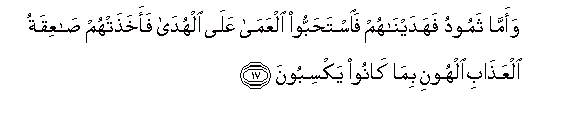 17. Na ama Thamudi tuliwaongoza, lakini walipenda upofu kuliko uwongofu.