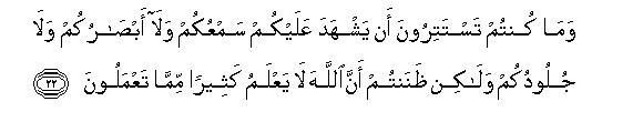 na ngozi zenu, zisikushuhudilieni. Lakini mlidhani kwamba Mwenyezi Mungu
