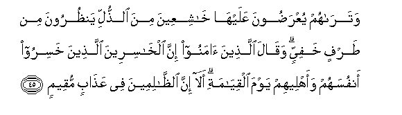 45. Na utawaona wanapelekwa kwenye Moto, nao wamenyenyekea kwa unyonge,