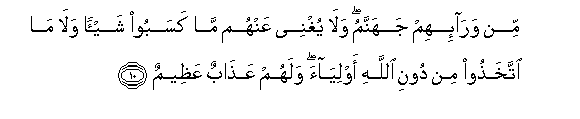 10. Na nyuma yao ipo Jahannamu. Na walio yachuma hayatawafaa hata