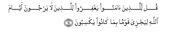 14. Waambie walio amini wawasamehe wale wasio zitaraji siku za Mwenyezi